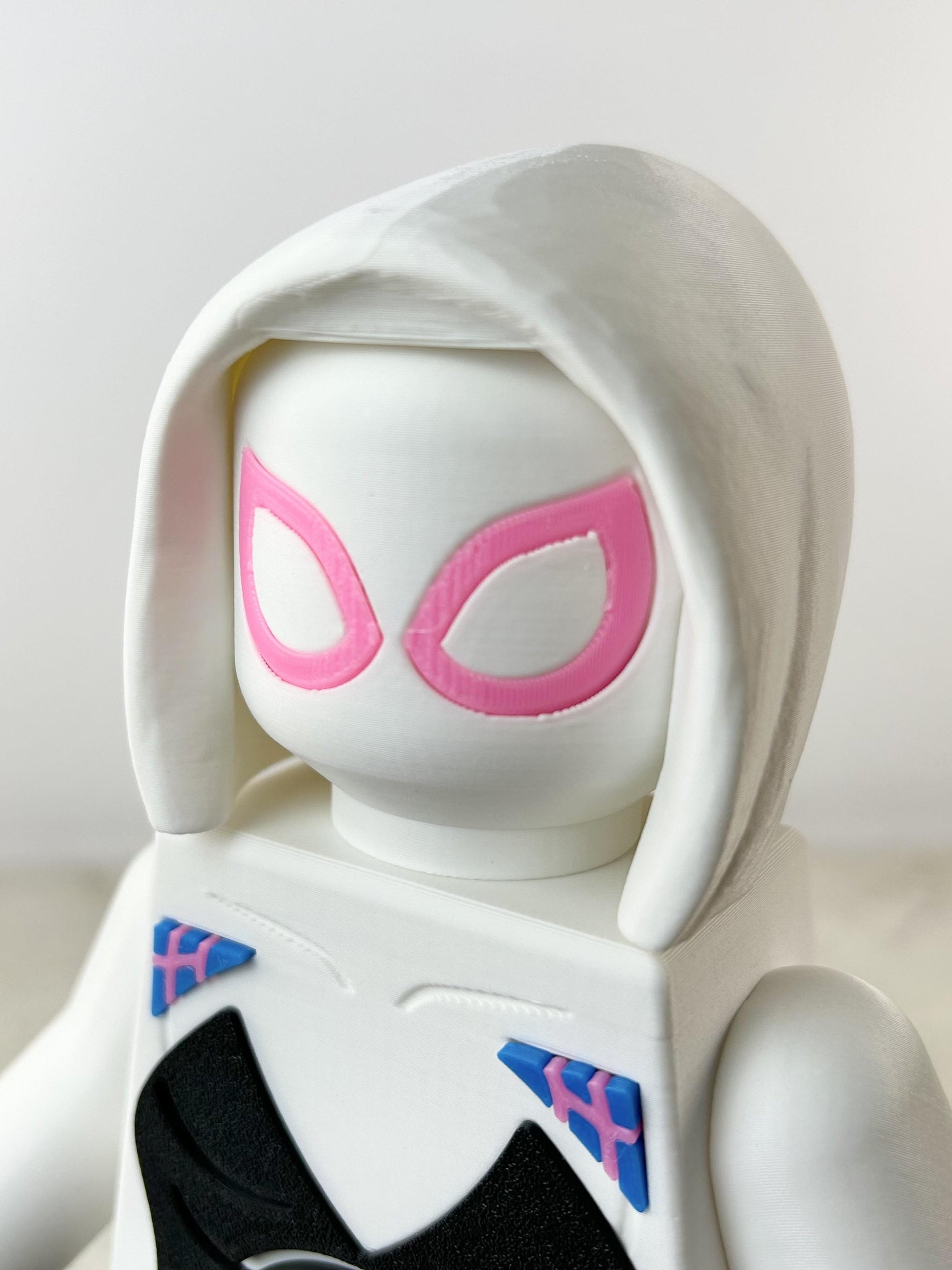 Swing into style with this 3D printed brick-style Spider-Gwen figure inspired by the fan-favorite heroine from the Marvel universe. Standing approximately 9 inches tall, this collectible highlights Spider-Gwen’s signature white, pink, and black suit with detailed web patterns and a dynamic stance that captures her confident energy.